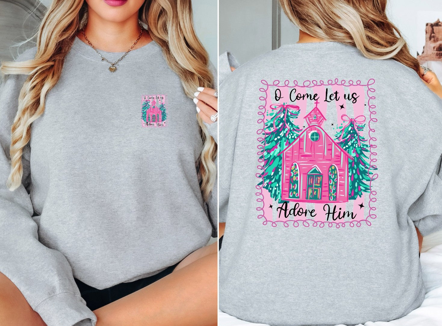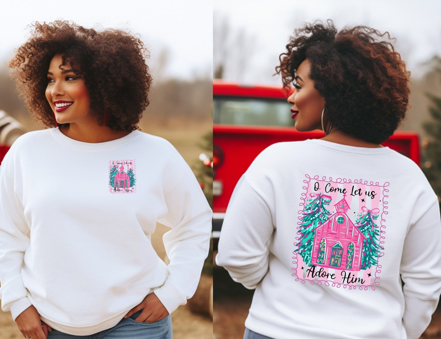 Spread the true meaning of Christmas in style with our Oh, Come Let us Adore Him Sweatshirt or T-shirt! This adorable design features A pink church showing the true meaning of Christmas, complete with a modern twist to your holiday look.