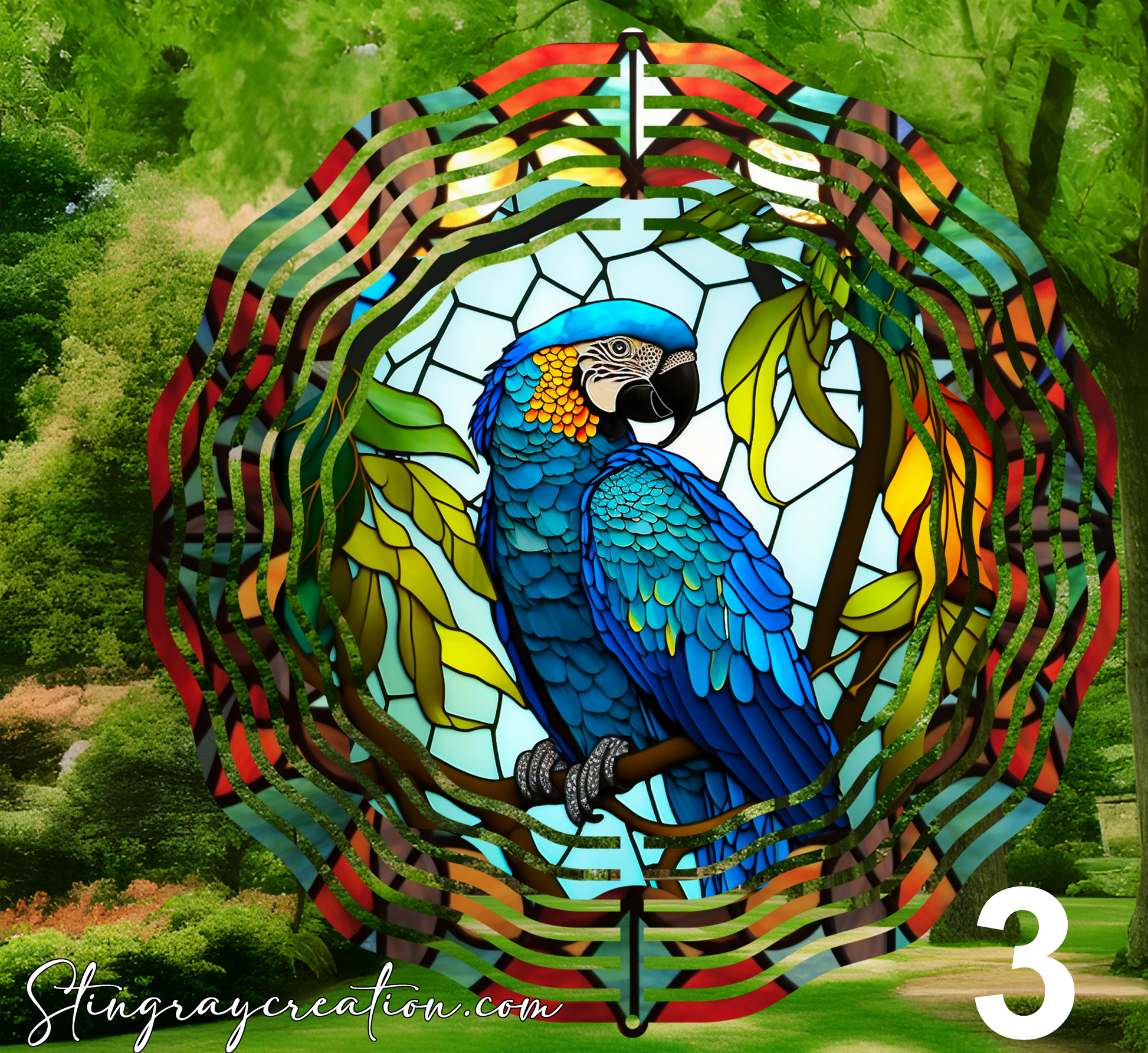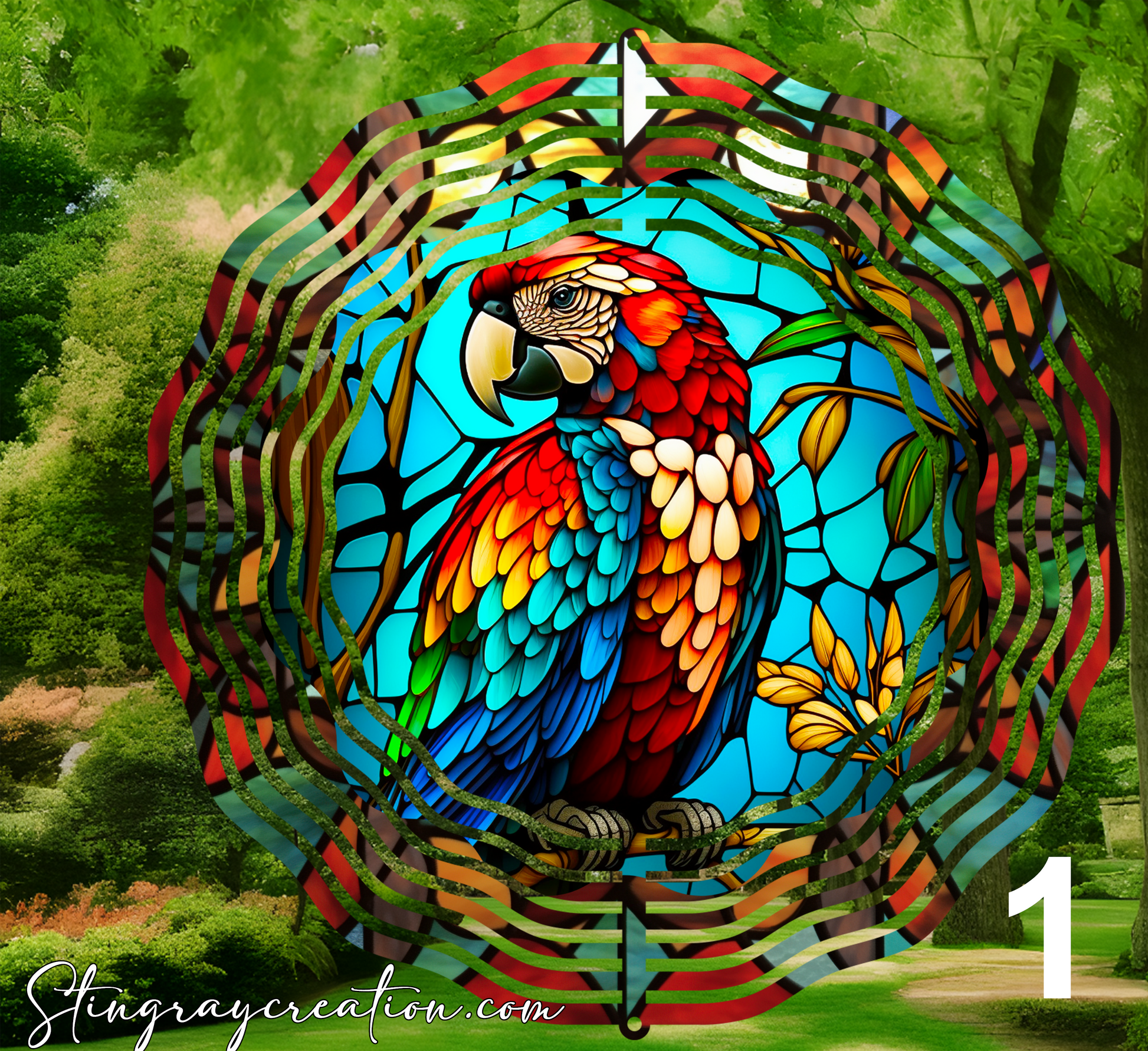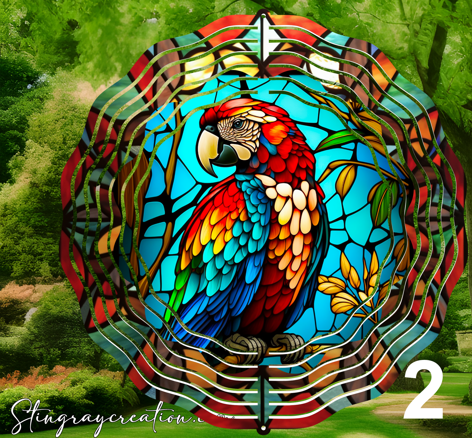 This is a double-sided wind spinner. Beautiful for in the garden. For long lasting care keep in a shaded area away from direct sunlight.