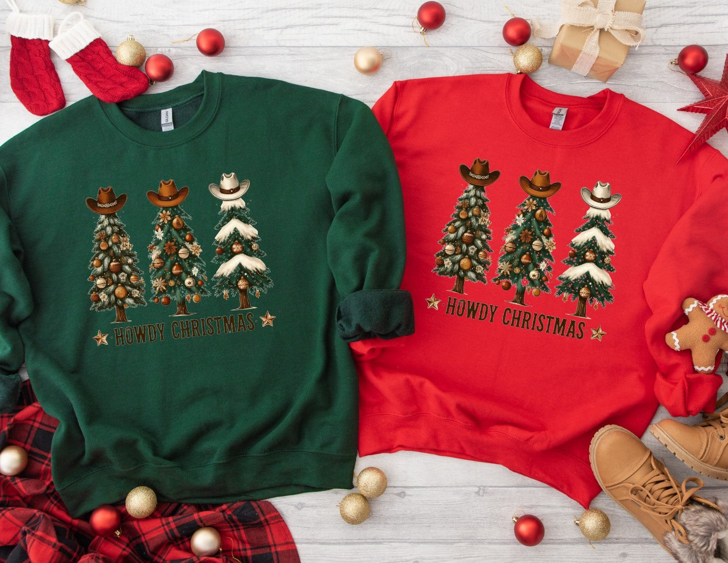 Say howdy to the holidays with our Howdy Christmas Sweatshirt Or T-shirt! This festive western-inspired design features three decorated Christmas trees topped with cowboy hats and the phrase Howdy Christmas in rustic lettering. It’s the perfect mix of cozy holiday charm and country style.