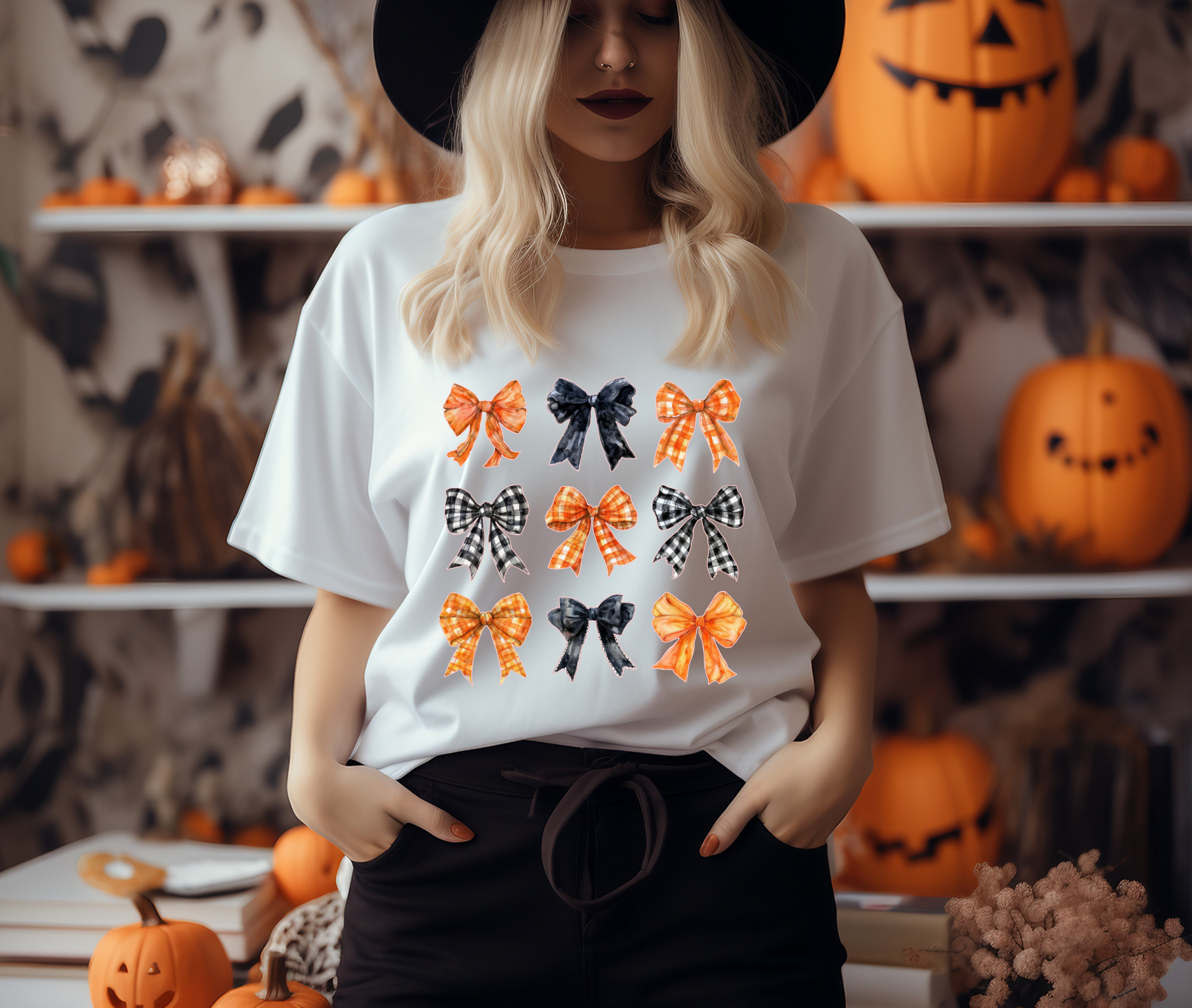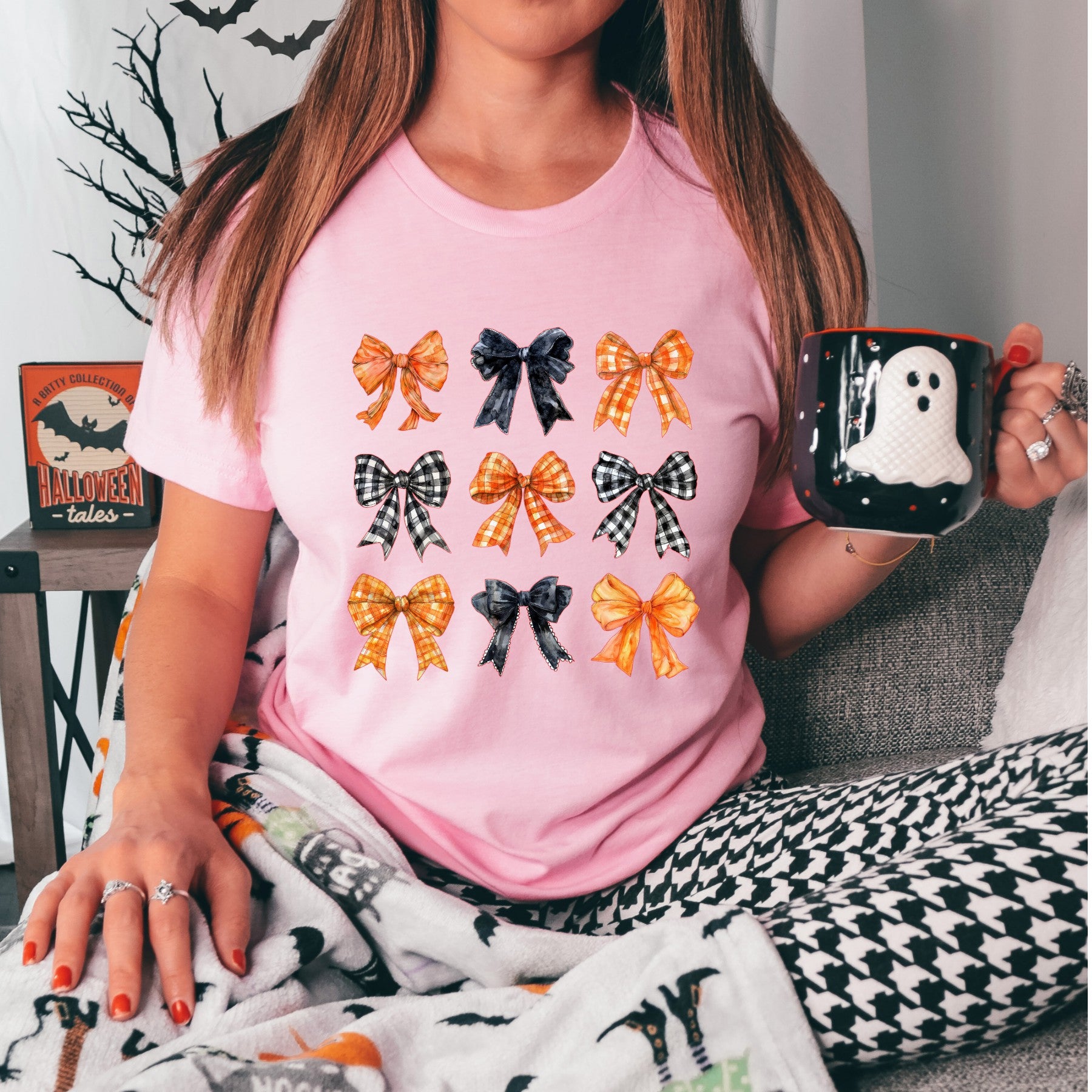 Get ready for the Halloween season with this cute pink spooky batty t-shirt! Its graphic pattern and bow embellishment add a chic touch to your casual outfit.