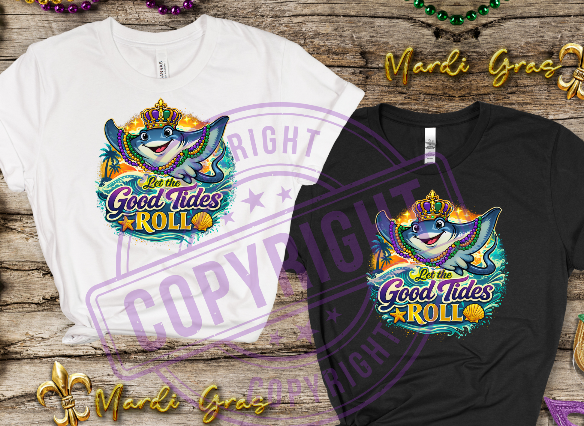 Bring the party to the coast with our βLet the Good Tides Rollβ graphic tee! Featuring a joyful stingray rocking a royal crown and colorful Mardi Gras beads, this design blends coastal charm with festive flair. Bursting with vibrant purples, greens, and golds, itβs the perfect shirt for parades, festivals, beach days, or anytime you want to let the good vibes roll.