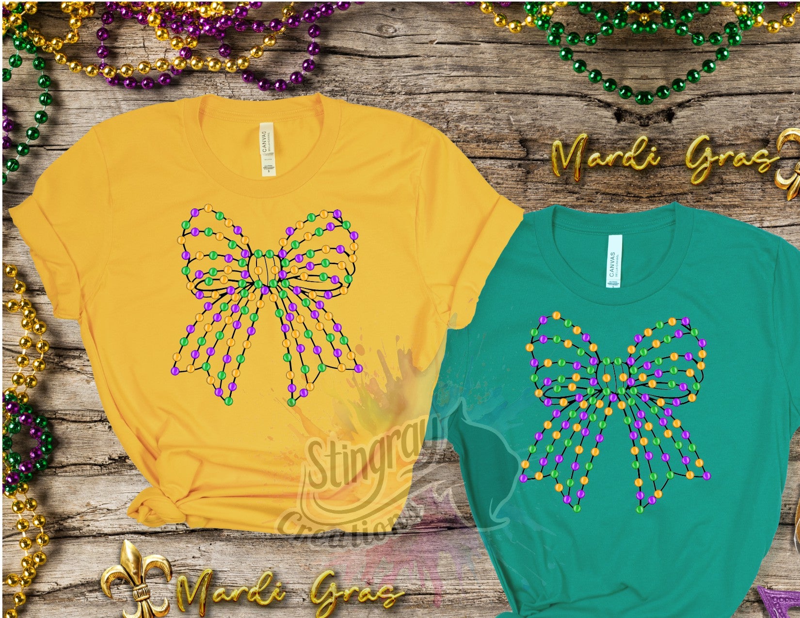 This beaded bow tee is the perfect addition to any Mardi Gras celebration! Ideal for adults and children alike, this shirt is made of high-quality materials and features a unique and fun design that captures the festive spirit. Show off your love for the holiday with this fun and comfortable tee.