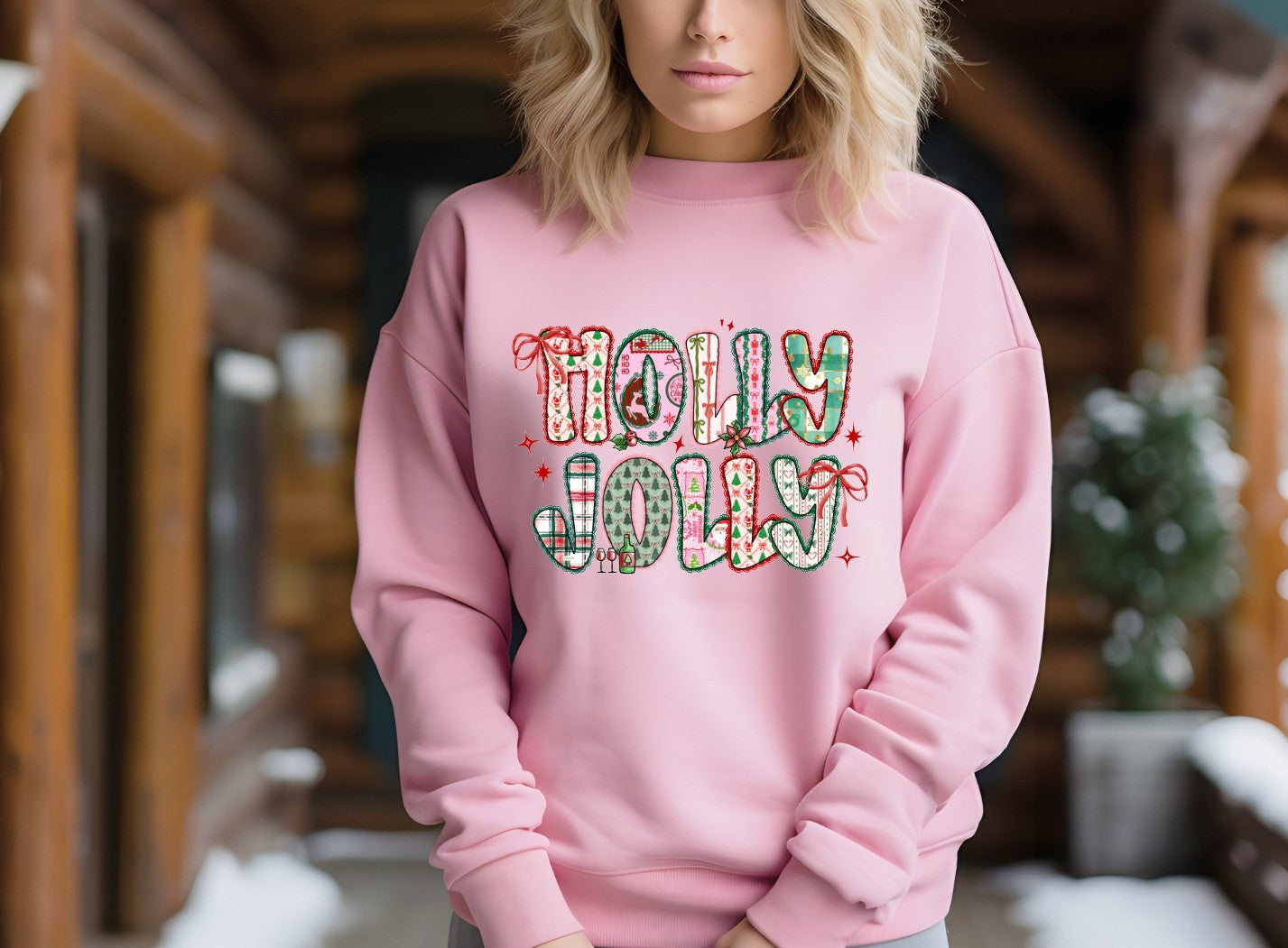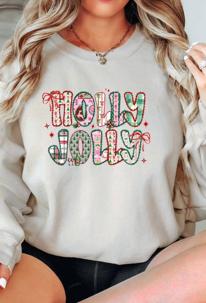 Get ready to spread merry vibes with our Holly Jolly Christmas Sweatshirt or T-shirt! This adorable design features a fun patchwork-style HOLLY JOLLY design decorated with candy canes, bows, and retro holiday patterns that capture the cheerful spirit of Christmas.