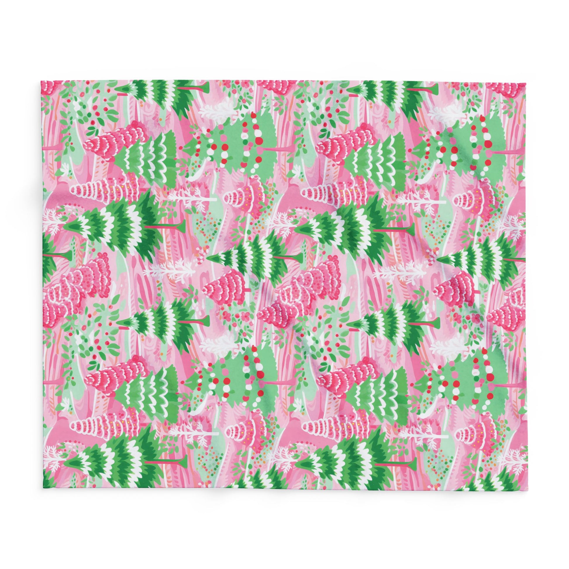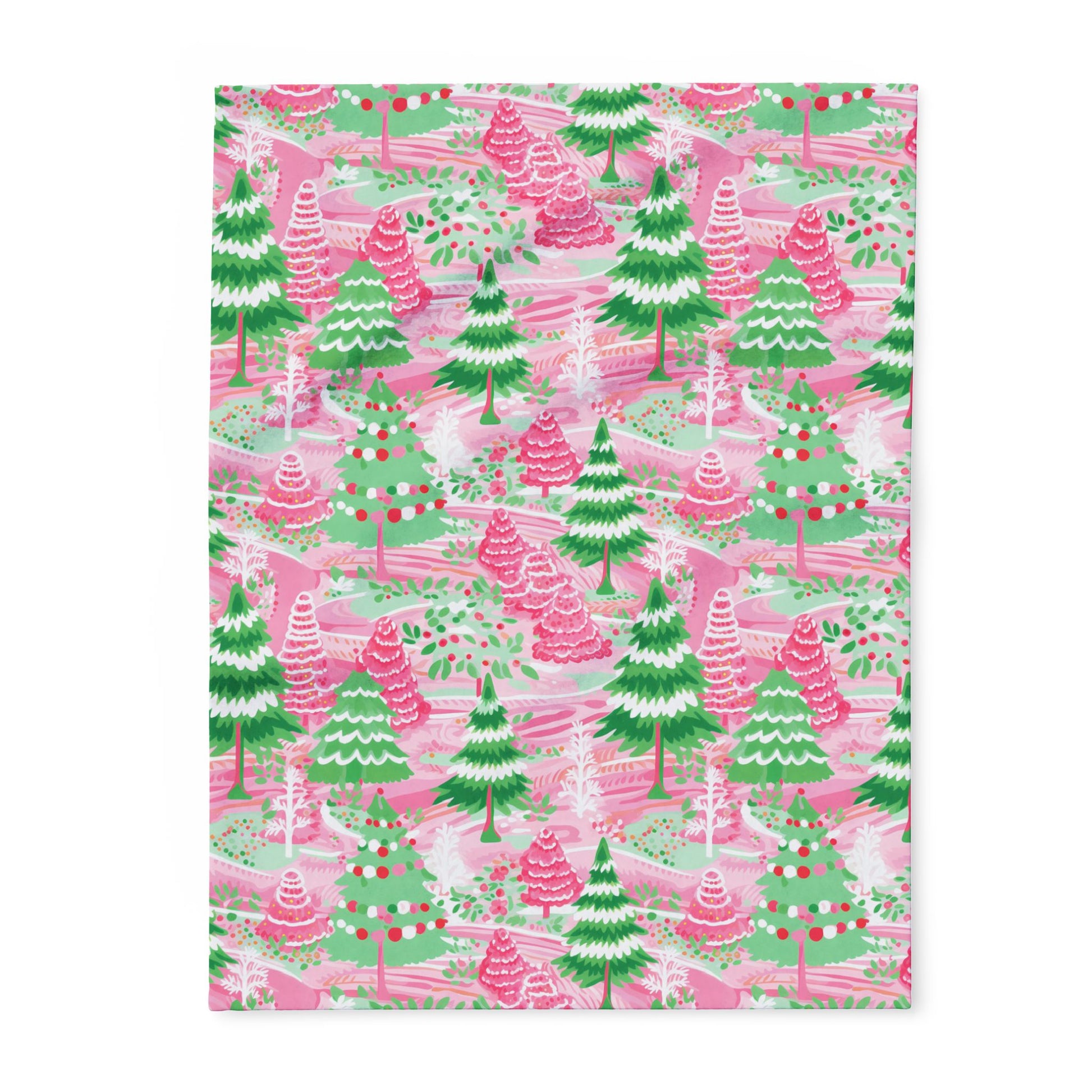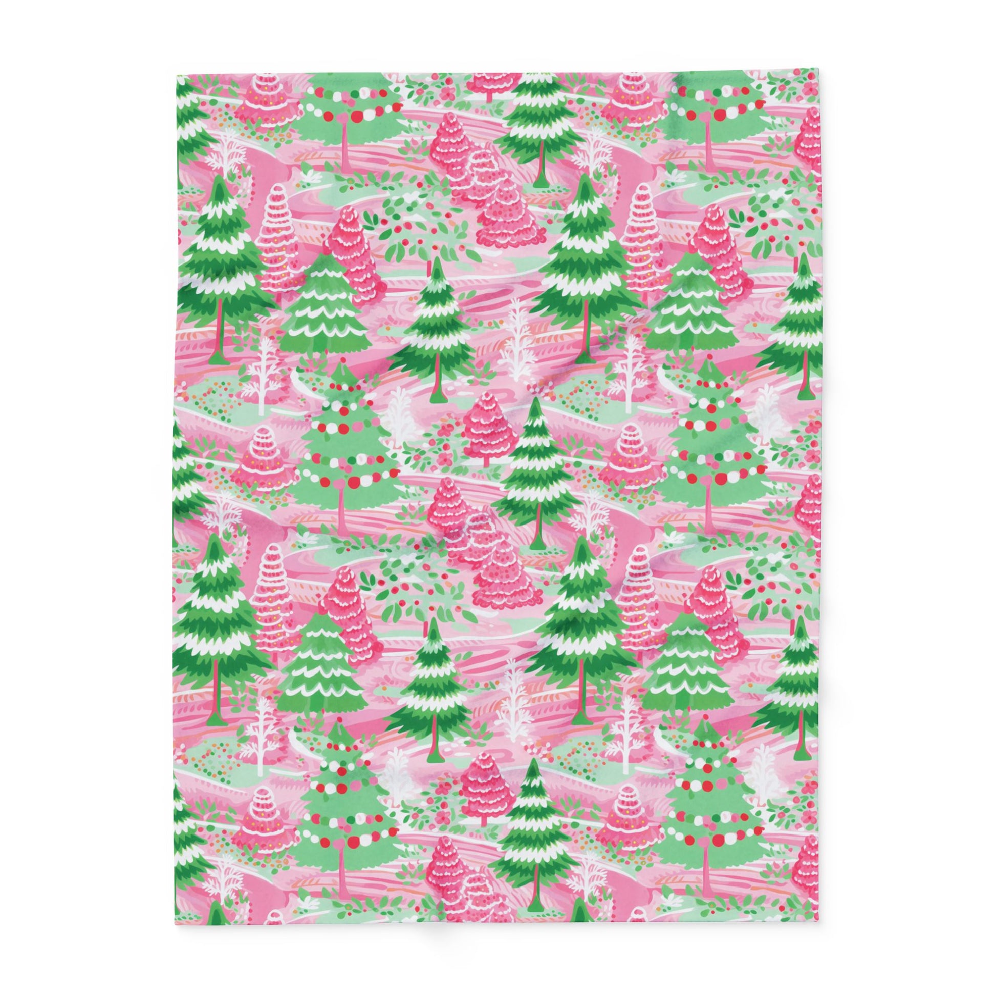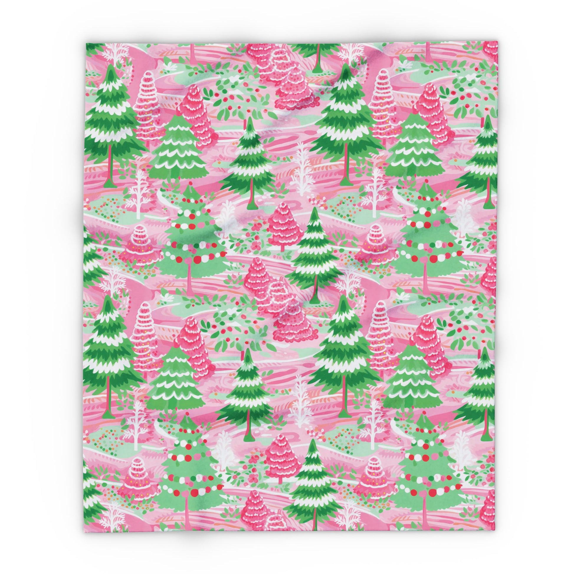 Step into a magical holiday woodland with our Peppermint Forest Design. This playful Christmas pattern features vibrant evergreens, frosted pink trees, festive garlands, and whimsical details set against a pastel pink landscape. With its bright pops of green, red, and white, it brings a candy-coated twist to the traditional holiday forest.