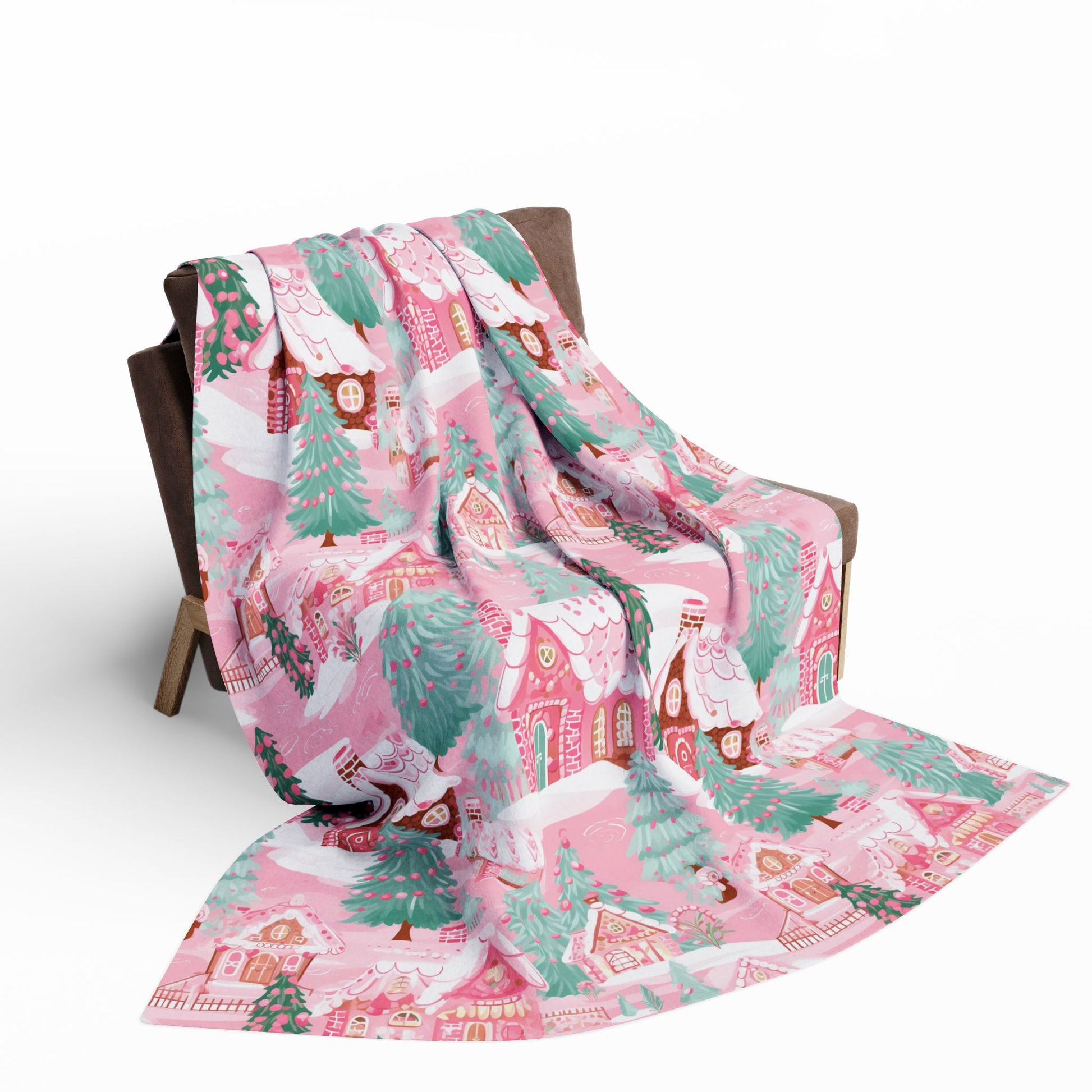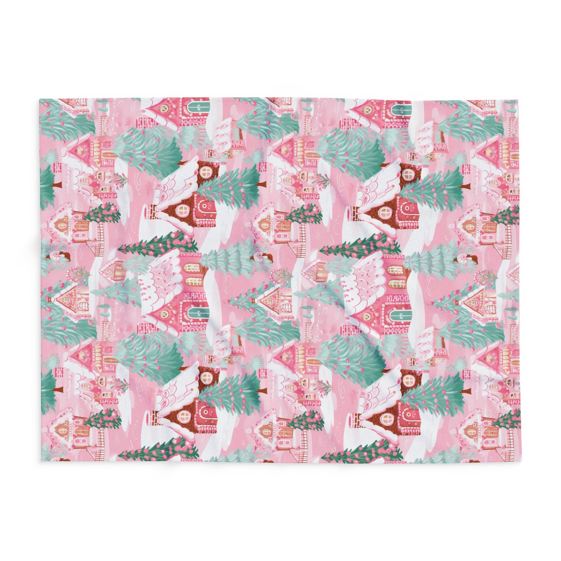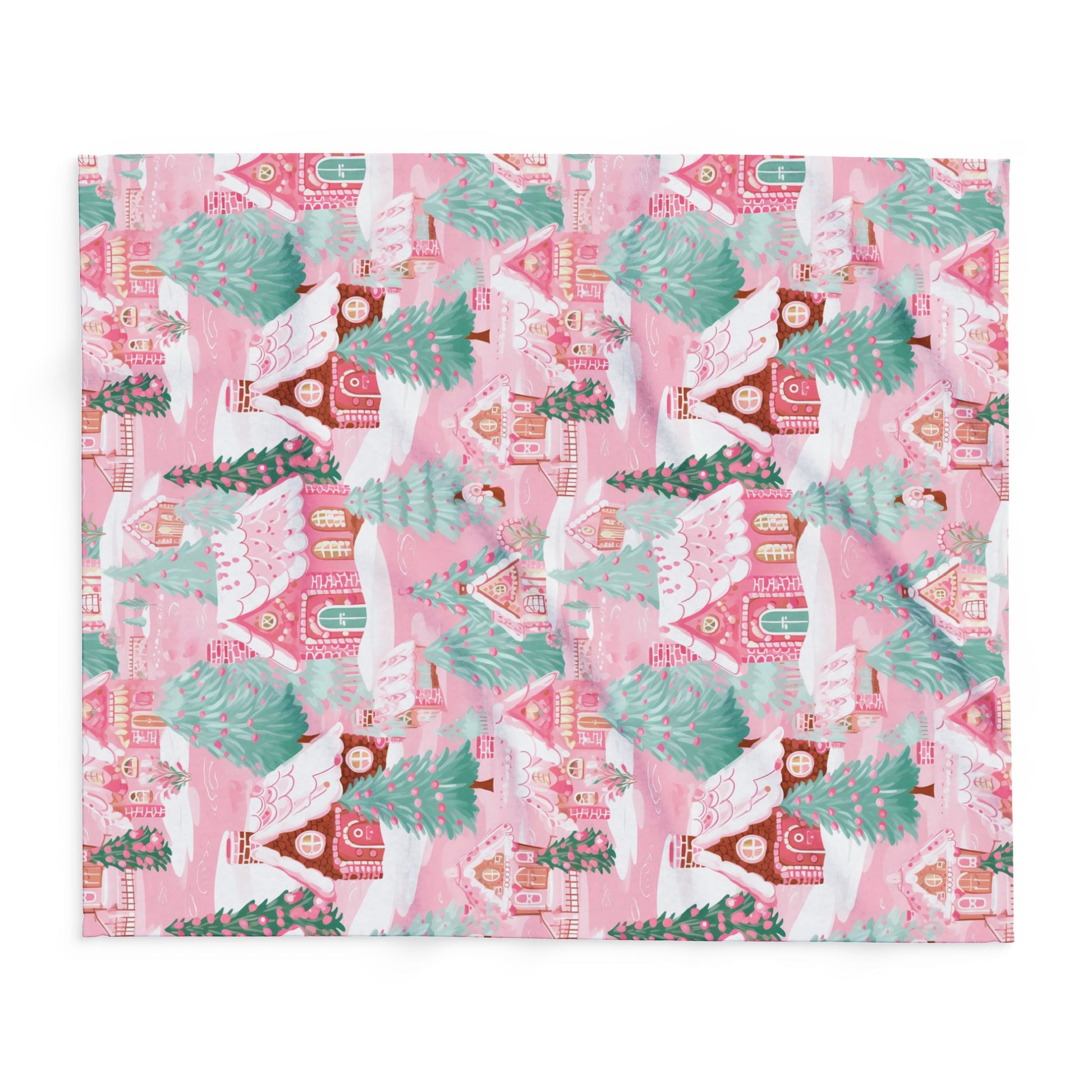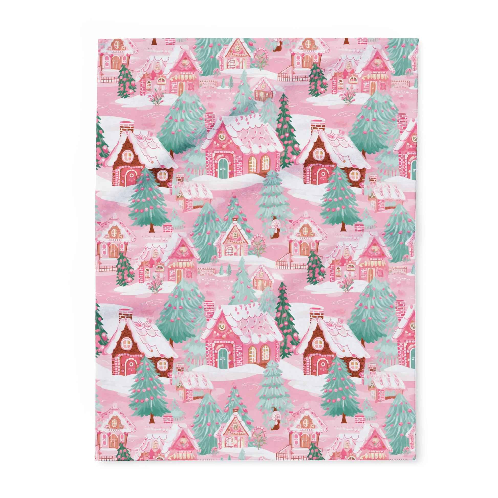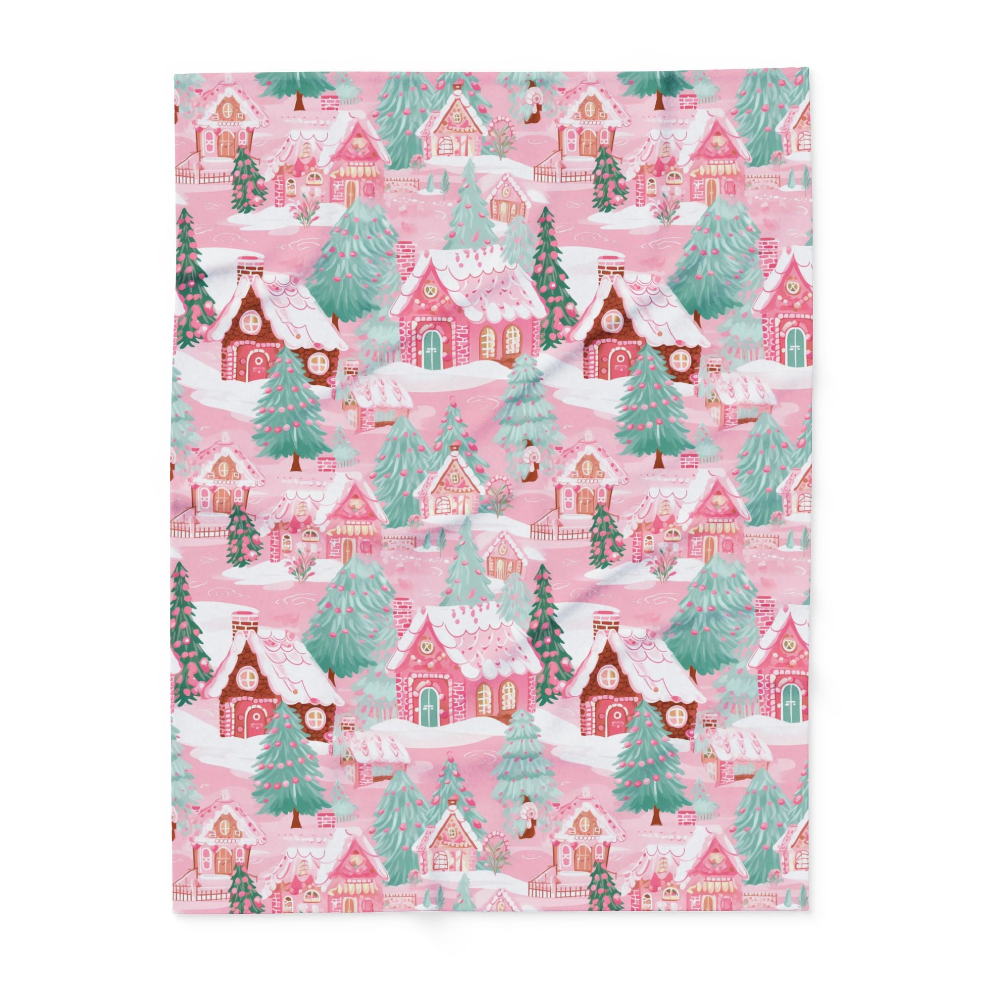 Perfect for festive blankets, holiday décor, apparel, or gift wrap, this design brings a soft, playful twist to the classic Christmas village. The delicate pastel palette of pinks, whites, and mint greens makes it perfect for anyone who loves sweet, girly, and magical holiday vibes.