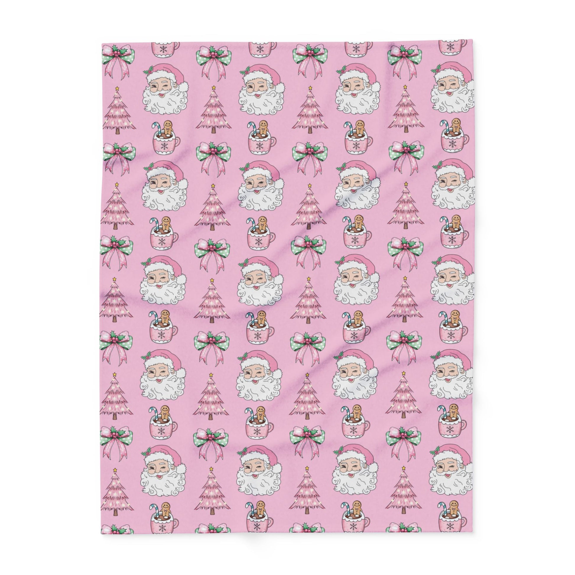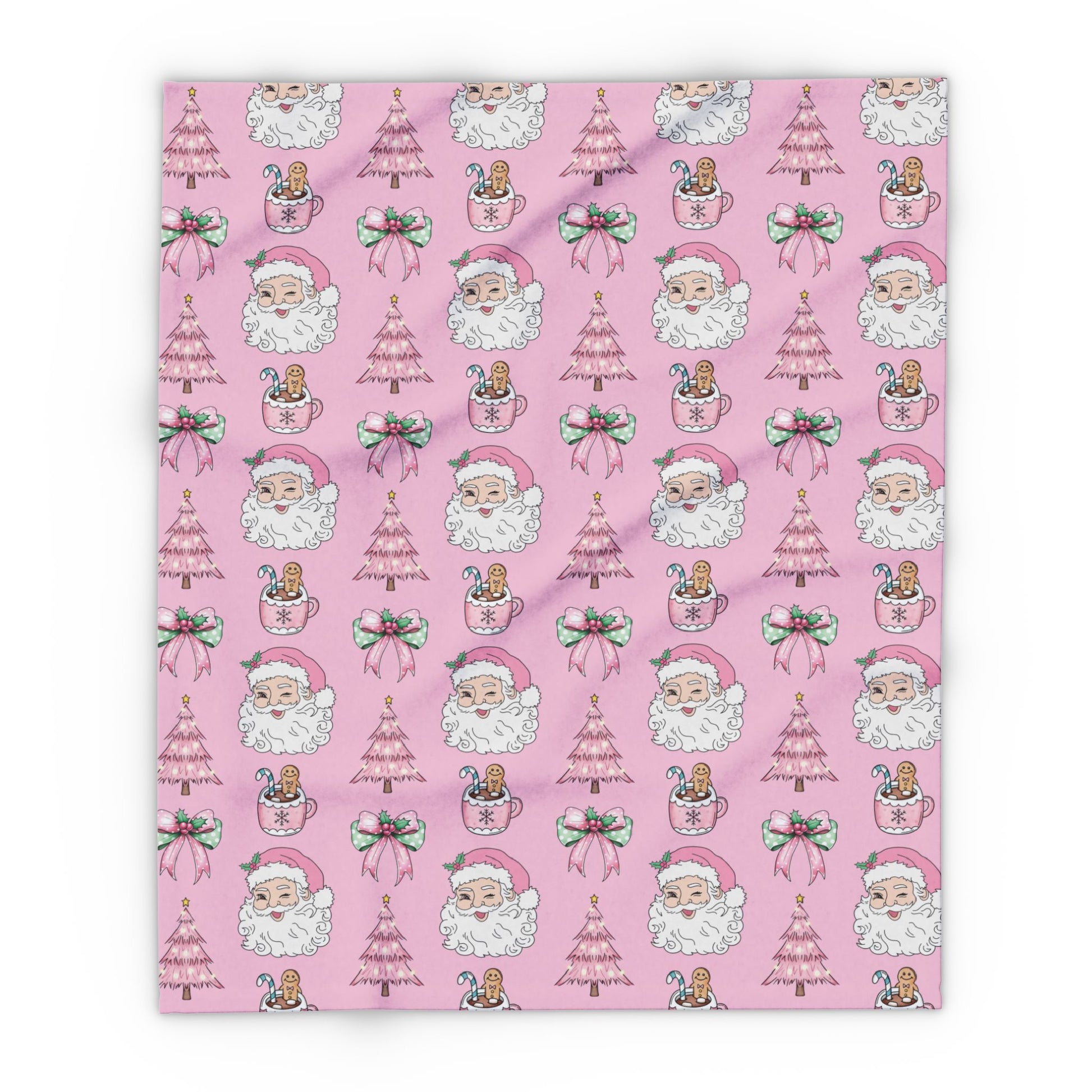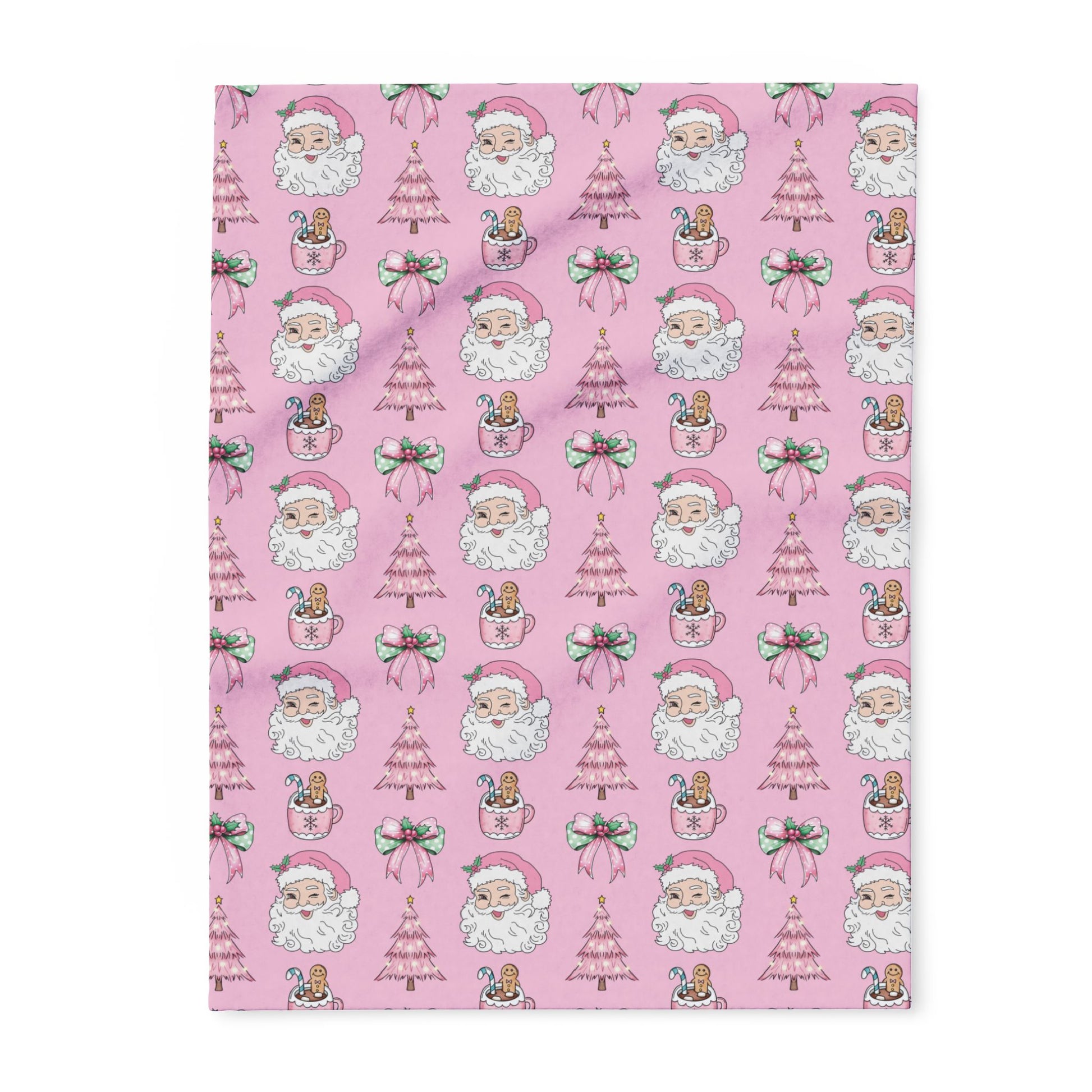 Add a playful twist to your holiday season with our Pink Christmas Magic Blanket. This festive design features a winking Santa, pink Christmas trees, gingerbread hot cocoa mugs, and sweet holiday bows — all set against a charming pastel pink background.
