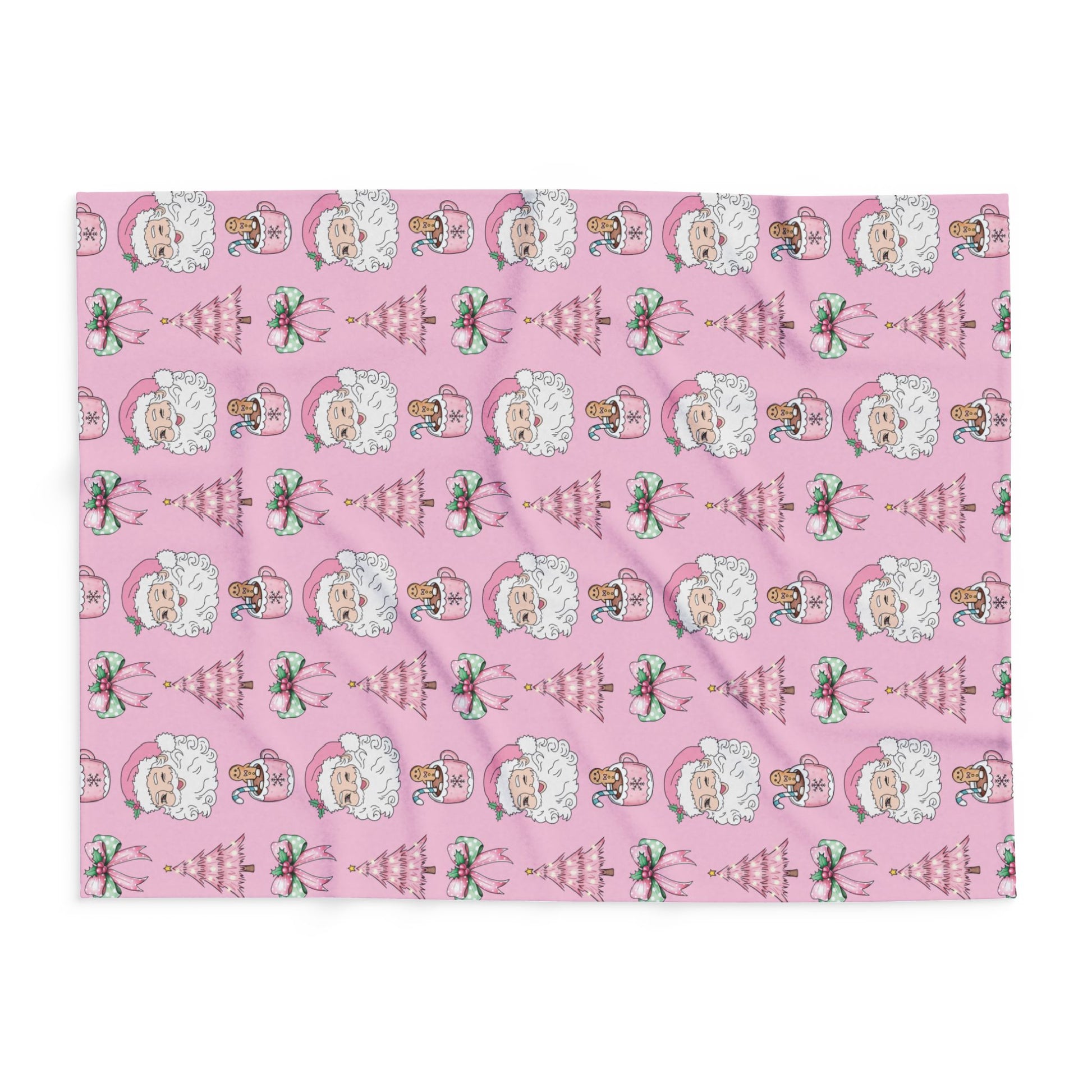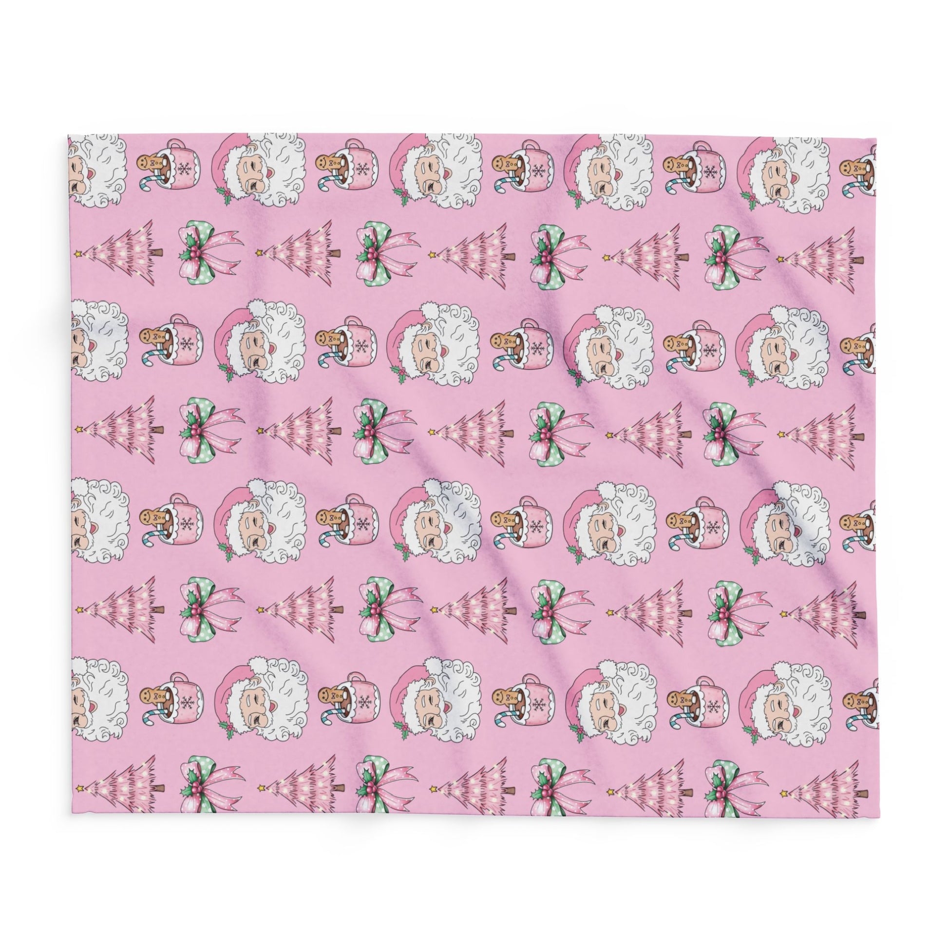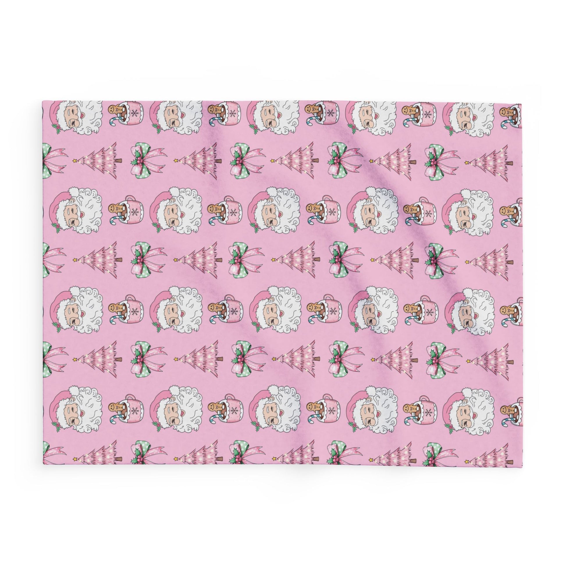 Add a playful twist to your holiday season with our Pink Christmas Magic Blanket. This festive design features a winking Santa, pink Christmas trees, gingerbread hot cocoa mugs, and sweet holiday bows — all set against a charming pastel pink background.