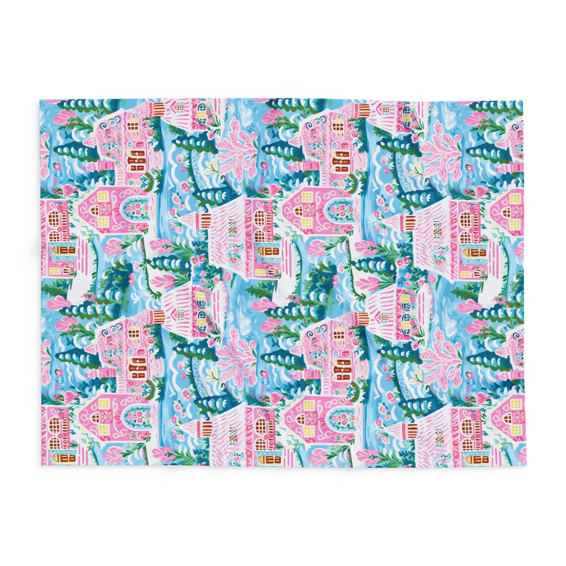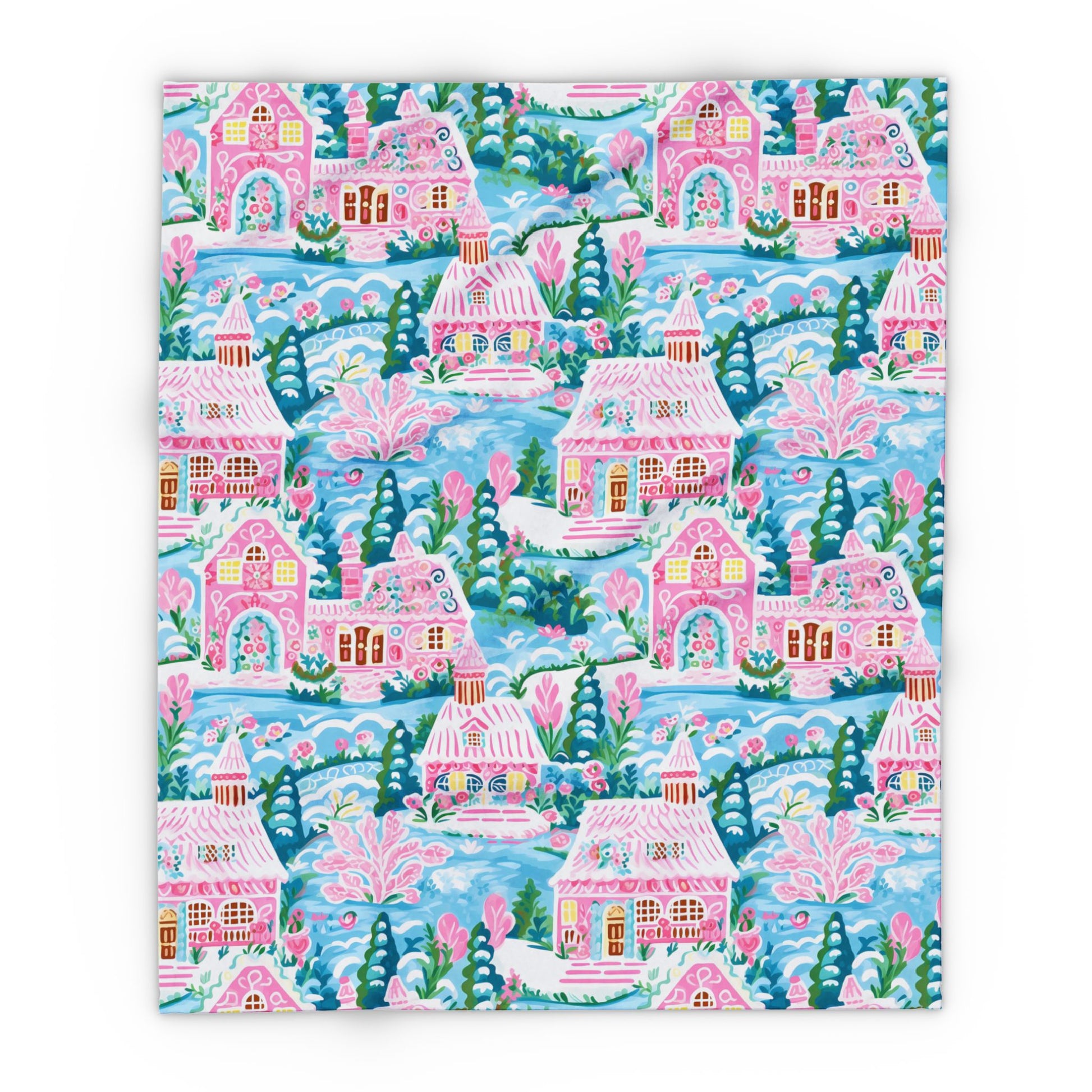Perfect for cozy blankets, holiday décor, apparel, or gift wrap, this design captures the charm of a Christmas village with a sweet floral twist. It’s ideal for anyone who loves pastel holiday aesthetics, romantic seasonal vibes, and fairytale-inspired Christmas décor.